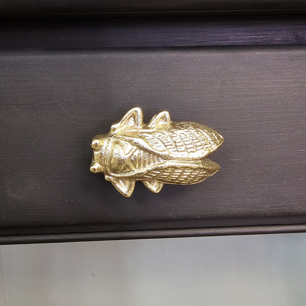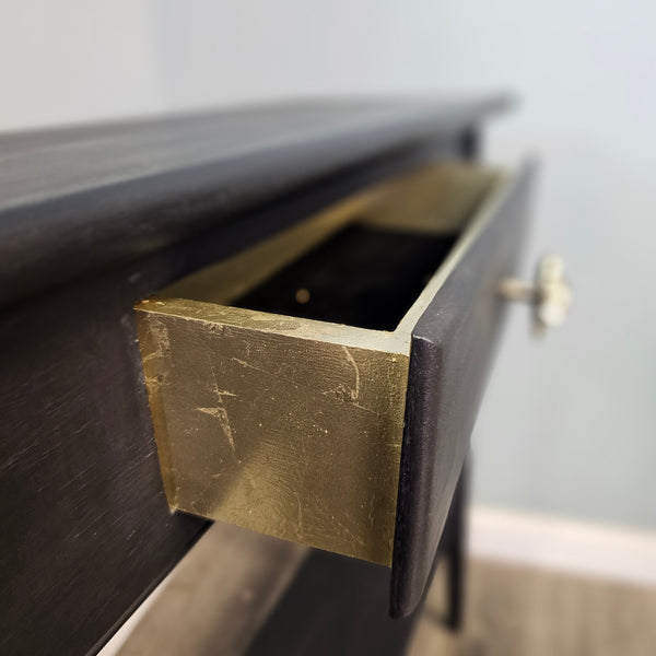 Console table painted Athenian Black Chalk Paint®, sealed with Annie Sloan Clear Wax. Drawers lined in black velvet, gilded in gold leaf, and accented with a gold cicada knob.